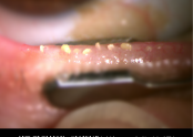 독서 시 글자가 휘어져 보였던 81세 여자환자 - 안저검사상 양안) 망막 전반에 드루젠 양상 보임- 망막OCT상 양안) 황반부에 건성 황반변성 소견 보임- 시력저하를 막기 위해 루테인을 정기적으로 처방함 황반변성 진단