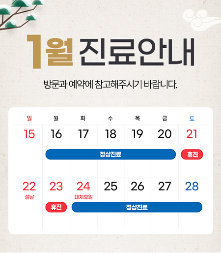 병원공지 | 23년 1월 진료 일정 안내드립니다. 페이지 정보 작성자 보스안과 작성일22-12-30 13:28 조회44,781회 댓글0건 관련링크 이전글 다음글 목록 본문 1월 21일 (토) - 1월 23일 (월) 설 휴진 1월 24일 (화) 대체 휴일은 정상 진료 합니다. 일정 확인하시어 예약 및 내원에착오 없으시길 바랍니다.감사합니다.