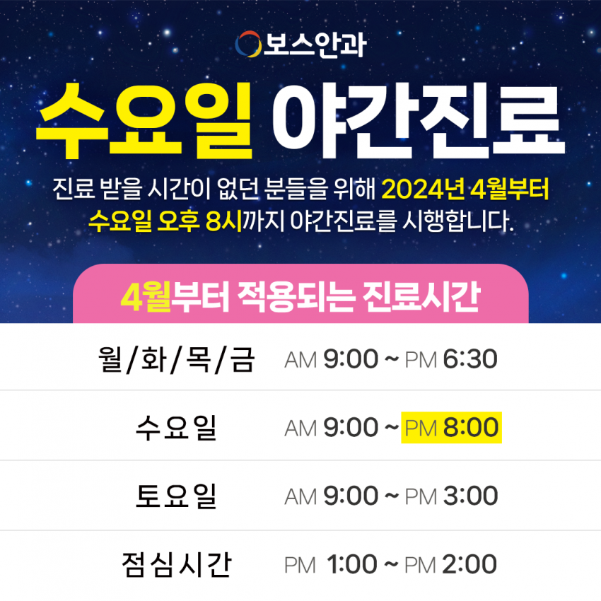 병원공지 | 2024년 4월부터 수요일 야간진료를 시행합니다. 페이지 정보 작성자 보스안과 작성일24-03-29 15:35 조회51,937회 댓글0건 관련링크 이전글 다음글 목록 본문