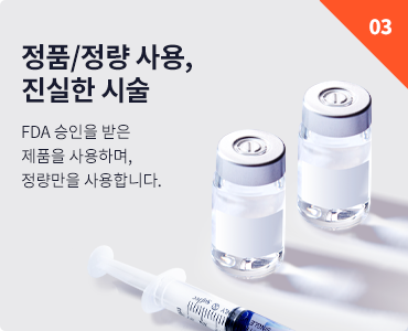 FDA 승인받은 정품만 사용하며, 정량만을 사용하여 보다 안전한 시술을 지향합니다.